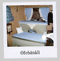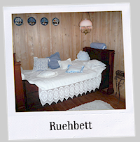 In der heimeligen Stube hat es einen Sitzofen mit Ofenloch (Zugang zum Zimmer im ersten Stock mit Heubett). Das Rueh-bett dient auch als Übernachtungsmöglichkeit für eine Person. |
